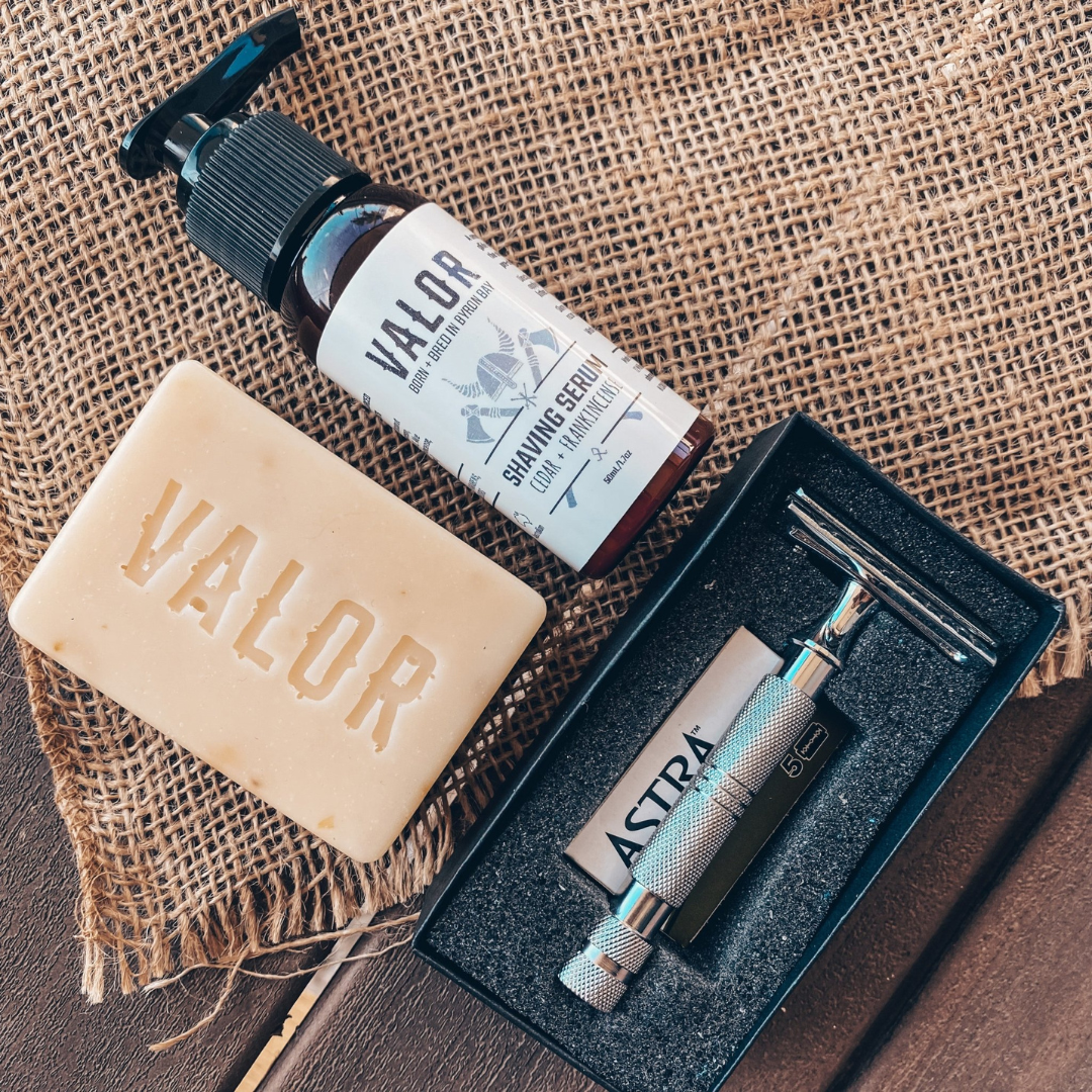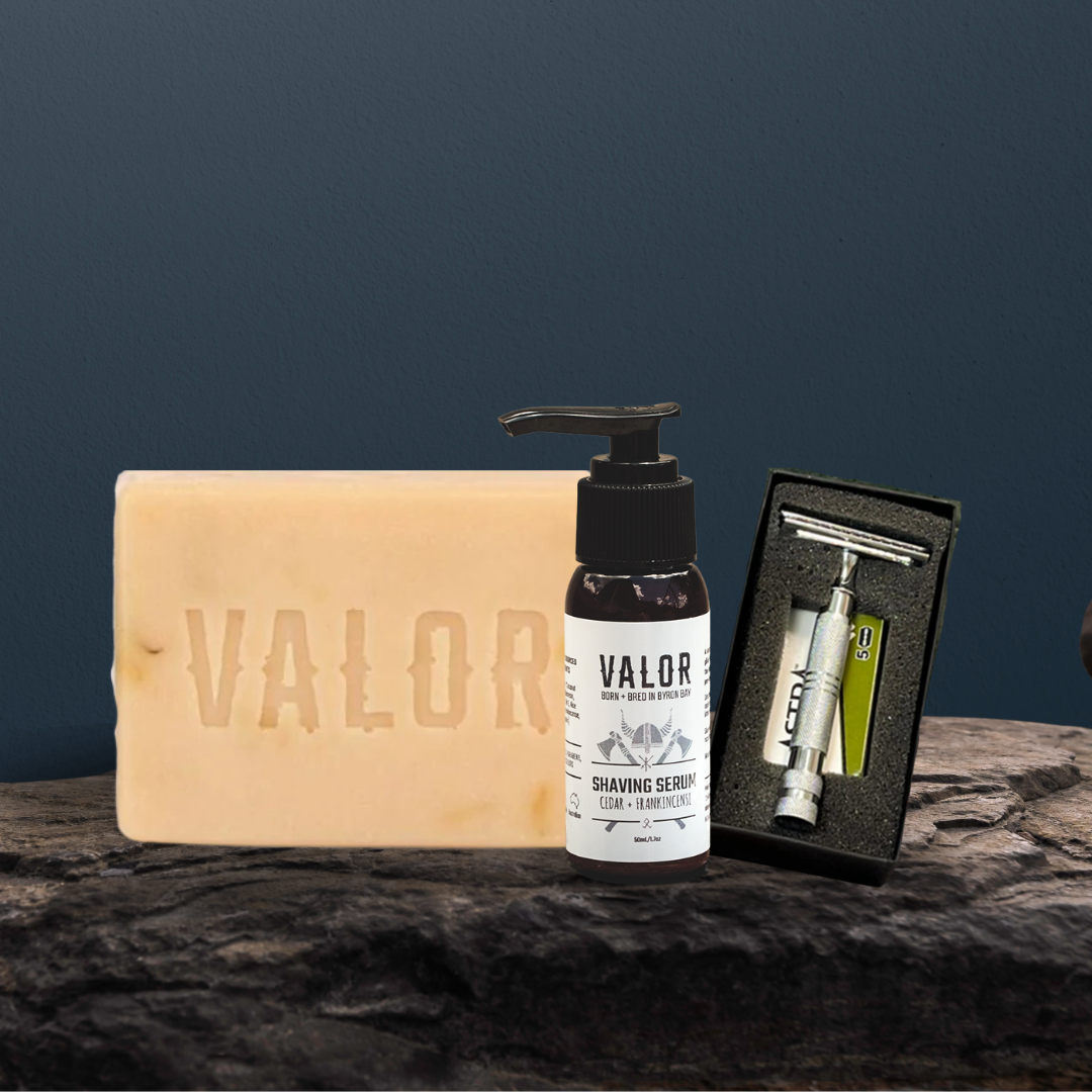 The Organic Olive Oil Soap works to gently cleanse the face and body, creating a sublime and refreshing shower. Followed by the Shave Serum and Safety Razor combo to give you the closest shave with the least amount of irritation every time. A smooth serum that provides glide for your shave while nourishing the skin. It not only helps give a smooth shave but also provides a cushion layer between the blade and skin, protects and hydrates, leaving skin soft and silky.